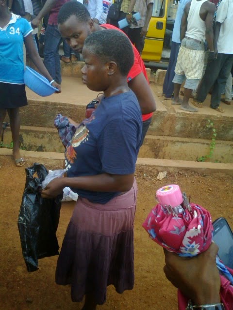 As was narrated by one of the occupants who was weeping, she said the pregnant woman who had entered the bus before the the one-eyed beggar had answered a call on her phone and a few bus-stops later, the one eyed beggar who was obviously identified as a beggar because of his music instrument entered the bus. When the pregnant woman wanted to then get down at her destination, she couldn't speak again, she tried motioning to the driver but the one eyed-beggar who sat beside her told the conductor that they haven't gotten to their destination and that the pregnant woman was his wife and that she was dumb. This caused confusion in the bus as some occupants of the bus had earlier seen her answer a call and also knew she didn't enter the bus together with the beggar. The driver then stopped the bus and as the occupants got down and narrated what happened in the bus to the crowd that had obviously gathered cause of the alarm they raised, the beggar still insisted the pregnant woman was dumb and was his wife.
